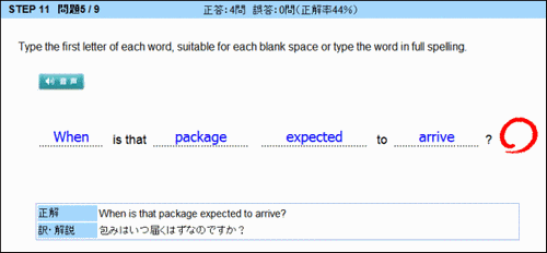 すべての空欄に正しい単語を入力するとマル、ひとつでも間違えると、バツが表示されます。 バツが表示された英文は正しく聞き取れるまで、繰り返し出題されます。学習を重ねるうちに、はじめは聞き取れなかった英文もしっかりと聴き取り、理解できるようになります。 日常会話でよく使われる単語や言い回しを、しっかりと覚えることも重要です。