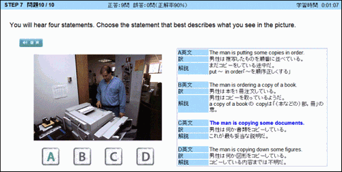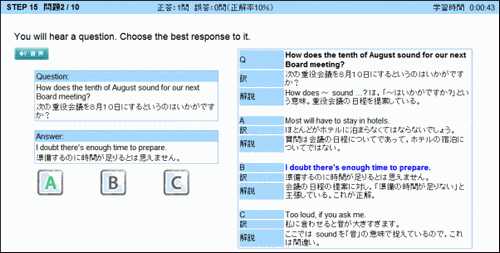 これらも全て音声は自動再生、正誤判定もTLTソフトが行い、間違えた問題を記録していきます。個々人の苦手な項目や問題のみを自動的に再出題するので、効率よく学習することができます。