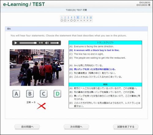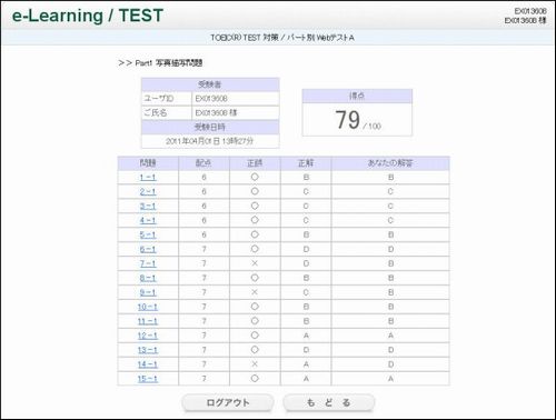 テスト終了後は、即時に採点が行われ、問題ごとの正誤情報が表示されます。問題ごとに問題文、解答、解説が表示されますので、 わからなかった問題もしっかりと確認できます。