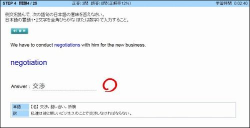 学習するのは、中学校で学ぶ単語を除く「センター英語用700単語と300熟語」。TLTソフトでは、これらセンター英語の頻出重要単語を、 「英‐和」「和‐英」「例文演習」の3つの学習形式により演習します。語と文を関連付けながら語彙力アップを図ります。