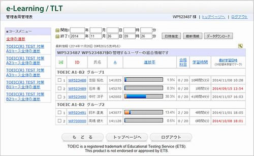 管理表には、ユーザーごとに進捗率や学習時間が表示されます。また、期間指定をすることによって夏期休暇、冬期休暇などの学習状況に絞って確認することもできます。