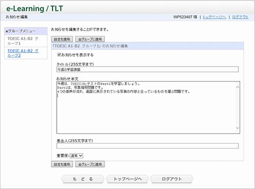 例えば、担当のクラスの学生の進捗状況が一目で分かる「管理者用管理表」、個々の学生に対して発信できる「メッセージ」機能、クラス全体に対する「お知らせ編集」機能、その他さまざまな機能があります。